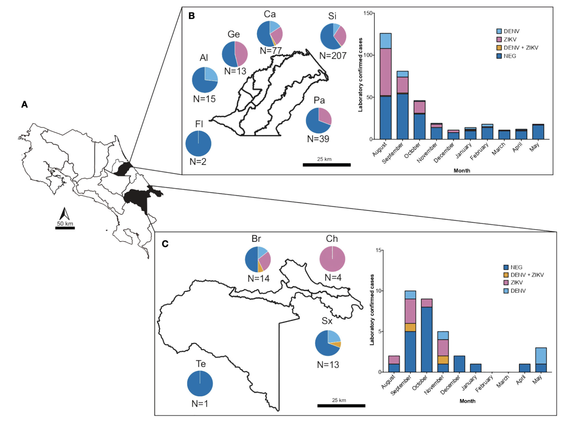 The increase in incidence and geographical expansion of viruses transmitted by the Aedes mosquitoes, such as dengue (DENV) and zika (ZIKV) in the Americas, represents a burden for healthcare systems in tropical and subtropical regions. These and other under-detected arboviruses co-circulate in Costa Rica, adding additional complexity to their management due to their shared epidemiological behavior and similarity of symptoms in early stages. Since diagnostics of febrile illness is mostly based on clinical symptoms alone, we gathered acute-phase serum and urine from 399 samples of acute dengue-like cases from two healthcare facilities of Costa Rica, during an outbreak of arboviruses from July 2017 to May 2018, and tested them using molecular and serological methods. The analyses showed that of the clinically presumptive arbovirus cases that were reported, only 39.4% (n=153) of the samples were confirmed positive by RT-PCR to be DENV (DENV (10.3%), CHIKV (0.2%), ZIKV (27.3%), or mixed infections (1.5%). RT-PCR for other alphaviruses and flaviviruses, and PCR for Leptospira sp were negative. Furthermore, to assess flavivirus positivity in post-acute patients, the negative sera were tested against Dengue-IgM. 20% of sera were found positive, confounding even more the definitive number of cases, and emphasizing the need of several distinct diagnostic tools for accurate diagnostics. Molecular characterization of the prM and E genes from isolated viruses revealed that the American/Asian genotype of DENV-2 and the Asian lineage of ZIKV were circulating during this outbreak. Two different clades of DENV-2 American/Asian genotype were identified to co-circulate in the same region and a difference in the platelet and leukocyte count was noted between people infected with each clade, suggesting a putative distinct virulence. Our study sheds light on the necessity for healthcare strategies in managing arbovirus outbreaks, emphasizing the importance of comprehensive molecular and serological diagnostic approaches, as well as molecular characterization. This approach aids in enhancing our understanding of the clinical and epidemiological aspects of arboviral diseases during outbreaks. Our research highlights the need to strengthen training programs for health professionals and the need to increase research-based on laboratory evidence for diagnostic accuracy, guidance, development and implementation of public health interventions and epidemiological surveillance.